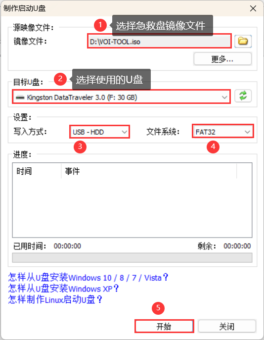 3.镜像文件选择VOI急救盘文件(VOI-TOOL.iso),选择目标U盘,写入方式为USB-HDD,文件系统选择FAT32,点击确定开始制作。