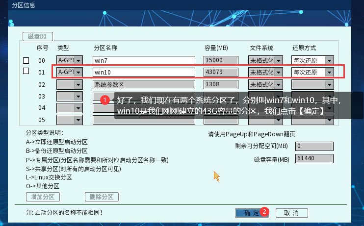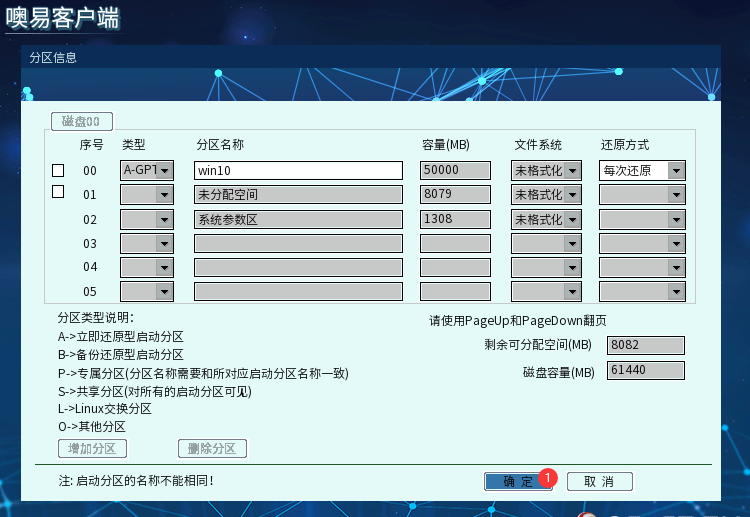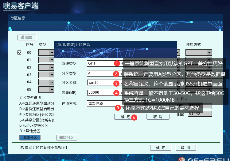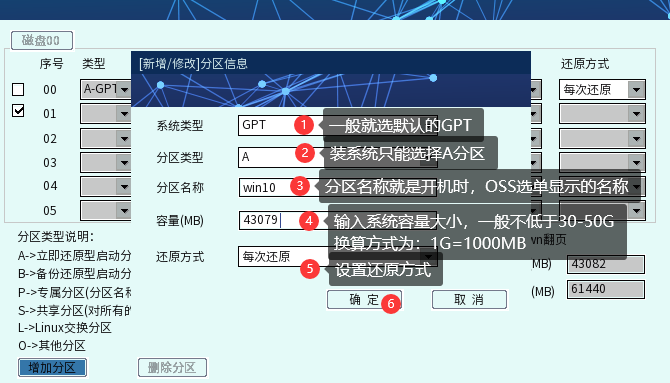 ④ 分区信息配置界面根据您的需求,配置好系统类型(分GPT和MBR传统方式)、系统名称(就是OSS选单界面显示的名称)、容量大小(一般操作系统最低不得低于30—50G)以及还原方式,其中,值得说明的是第2选项的分区类型(A表示用来装系统的,P表示用来装数据的,只能A类型分区的同名系统能使用,S也是表示数据盘,但可以多个A类型分区共同使用):