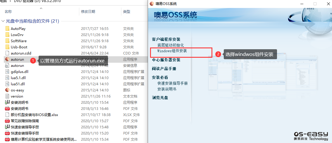 ①从选单界面,进入到windows中,打开OSS安装包,并以管理员方式运行【autorun.exe】程序,并点击【windows组件安装】