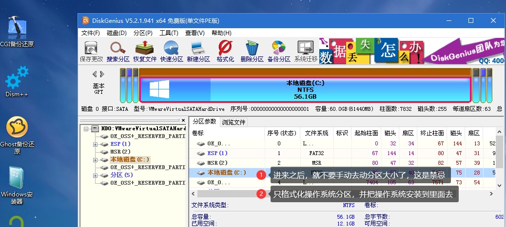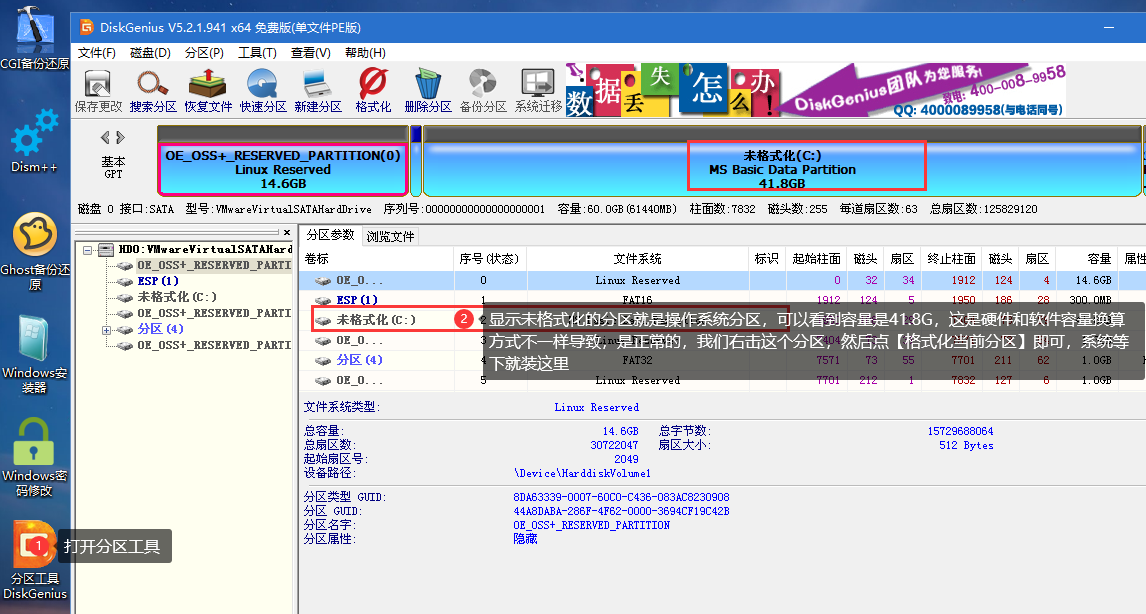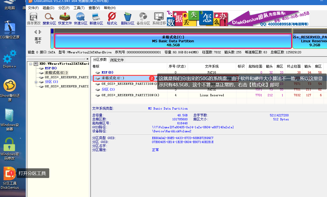 ⑥ 插入您的PE盘,从BIOS引导菜单选择从U盘进入,进到PE系统里面去,打开diskgen磁盘工具,格式化掉刚刚的那个分区,这里注意事项就是diskgen里面只格式化,不要去动分区大小,否则会破坏OSS所记录的信息,导致OSS异常: