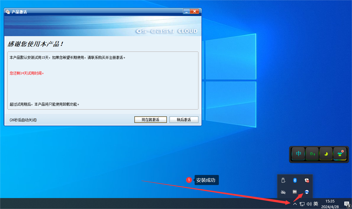 ④ 重启,再进到windows系统中,检查桌面右下角是否有了蓝色小球图标(OSS图标),有则安装成功;没有的话,可以尝试按ctrl L快捷键呼出;如果也呼不出,则需要手动运行开始目录下的【噢易功能平台】程序;否则,为安装不成功。