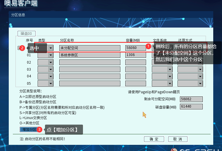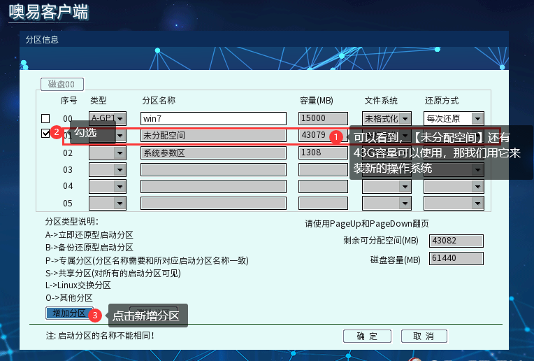 ③ 选中【未分配空间】的分区,并点击【增加分区】,进入到分区信息配置界面
