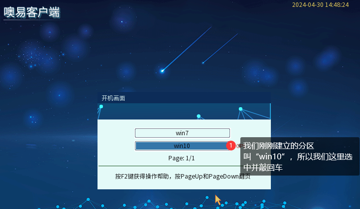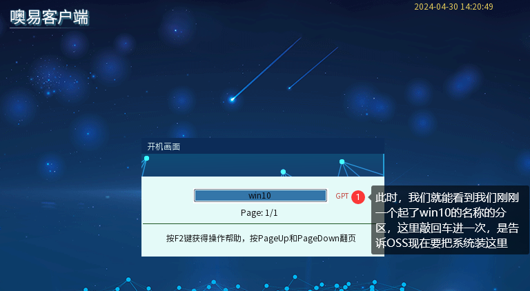 ④ 按ESC或者重启机器回到OSS选单界面,选择我们刚刚分出来的系统分区,敲一次回车进系统,这一步是告诉OSS现在要把系统装在哪个分区: