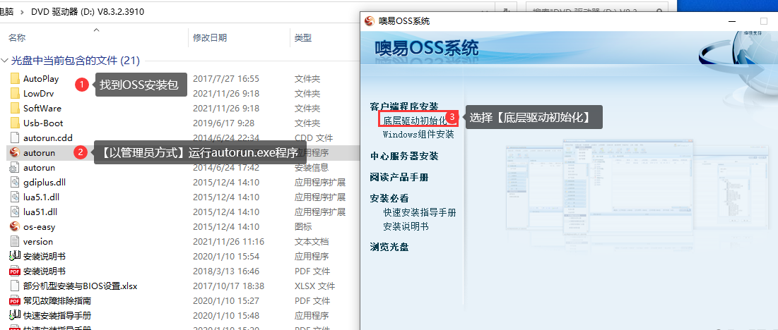 ① 进到操作系统中,打开OSS安装包,并以管理员方式运行【autorun.exe】程序,并选择【底层驱动初始化】
