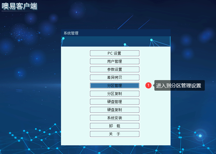 ① 首先,机器开机到OSS选单界面按F10,进入到OSS的菜单中,选择【分区管理】功能,如下图: