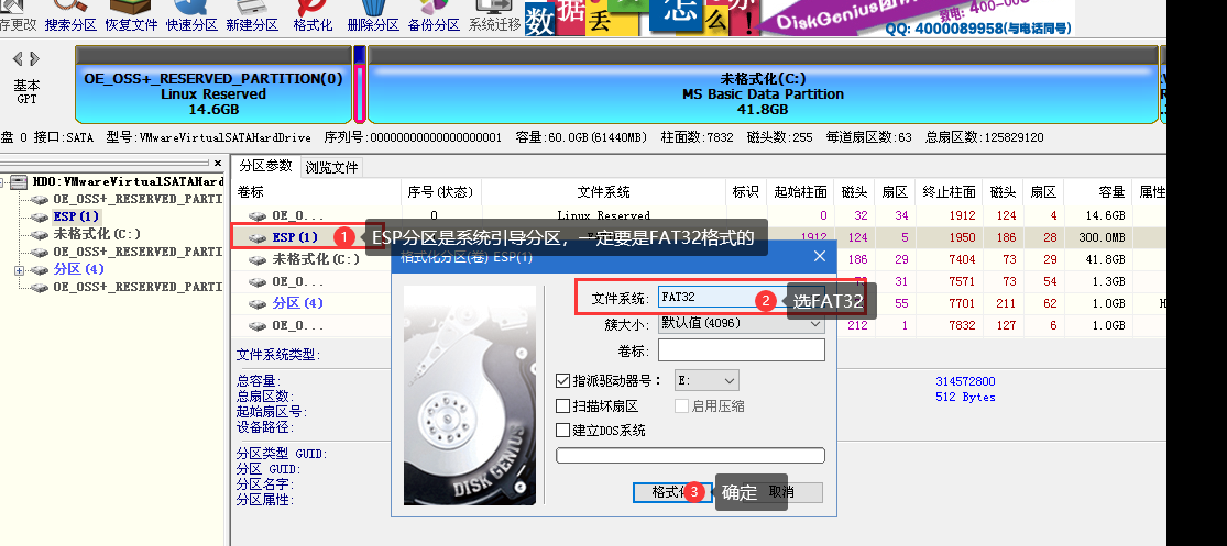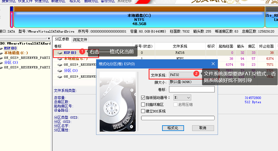 ⑦ 这个地方还有个需要注意的地方,您可以看到ESP分区(引导分区)它的格式类型是FAT16格式的,这个是错误的,您需要手动格式化成FAT32格式去,还是右击ESP分区——【格式化当前分区】,在对话框中选择【FAT32】格式: