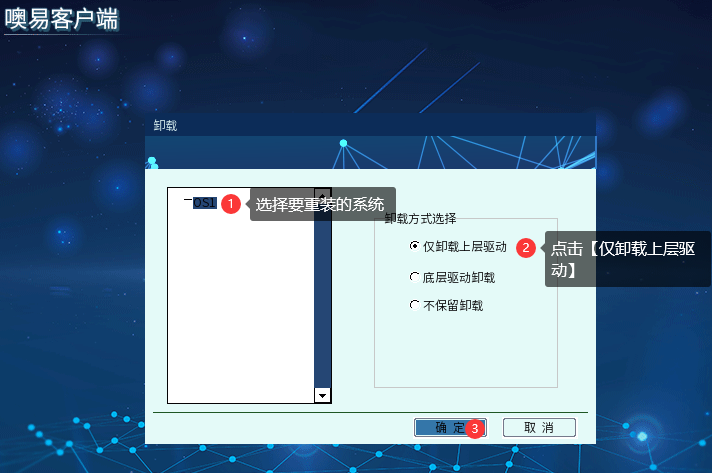 ① 原有分区重装,一定要先卸载掉原系统的上层驱动,具体卸载流程就是把机器开机到OSS选单界面按F10,执行【卸载】,选中要重装的操作系统,然后点【上层驱动卸载】,不然直接重装的系统可能会蓝屏,以下是图文操作教程。