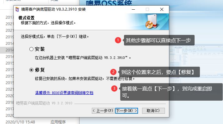 ② 所有安装过程都可以选【下一步】,其中到【安装/修复】界面,选择【修复】功能,并走完剩余的步骤: