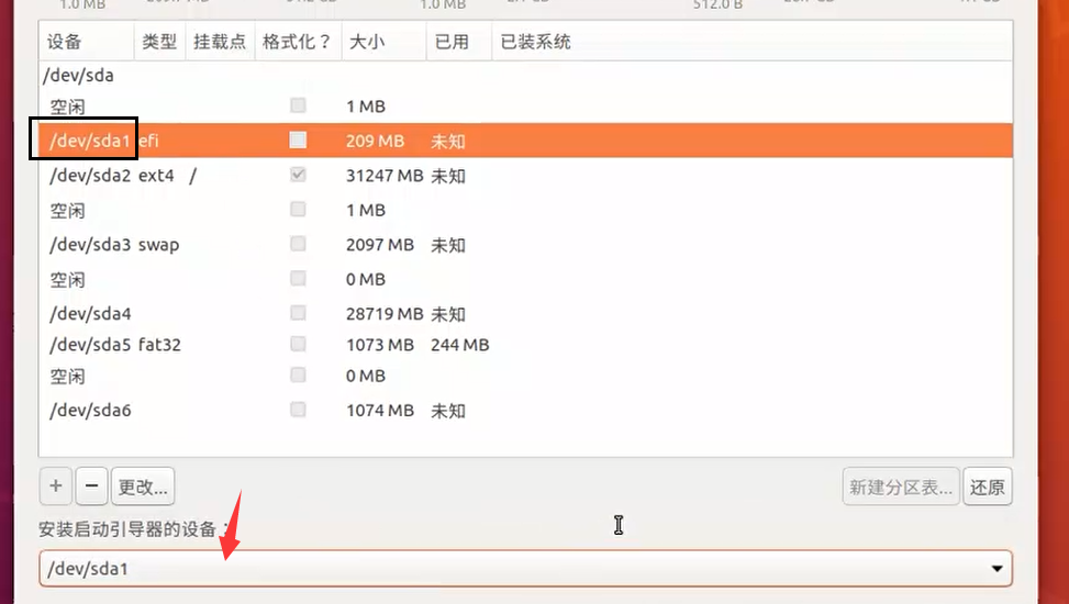 6.分区都挂载完成之后,把底部的启动引导器改为efi分区.如下图,efi分区是/dev/sda1.就选这个分区.