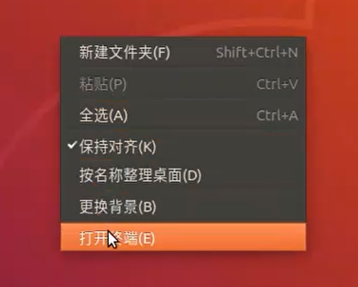 2.在桌面处右键单击,选择打开终端.进入终端命令界面.