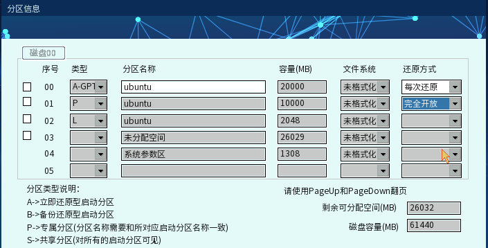 注意:v5版本安装时候分区选择A、S、P分区.A分区为ubuntu的/分区,文件系统为ext格式.S为home分区,P为swap分区.P和L分区不是强制要求,根据需求创建和分配大小.