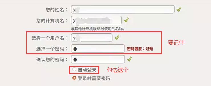 8.按需求设置姓名、计算机名等,用户名和密码需要自己记住,后面长期需要使用.选择自动登录.