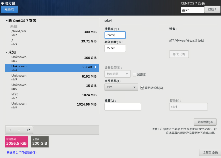 (10)挂载home分区: 选择/dev/sda4,选择EXT4格式,更新设置