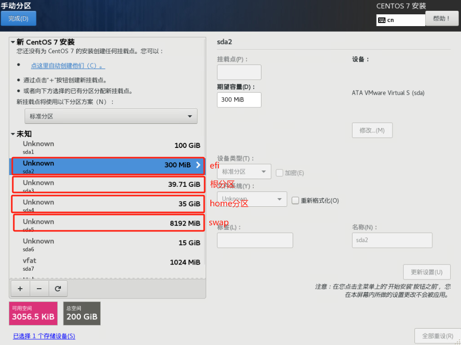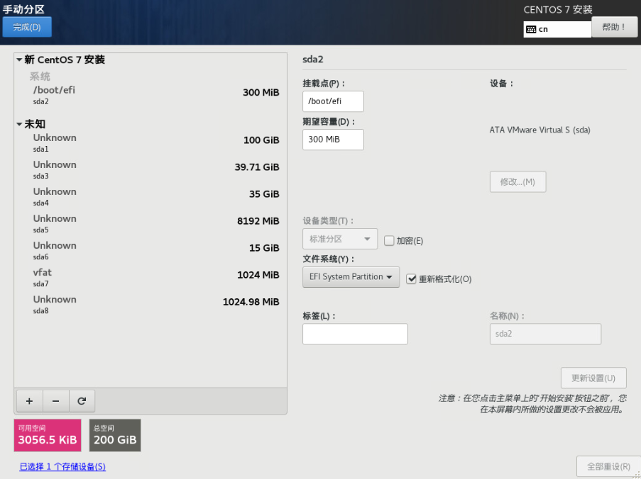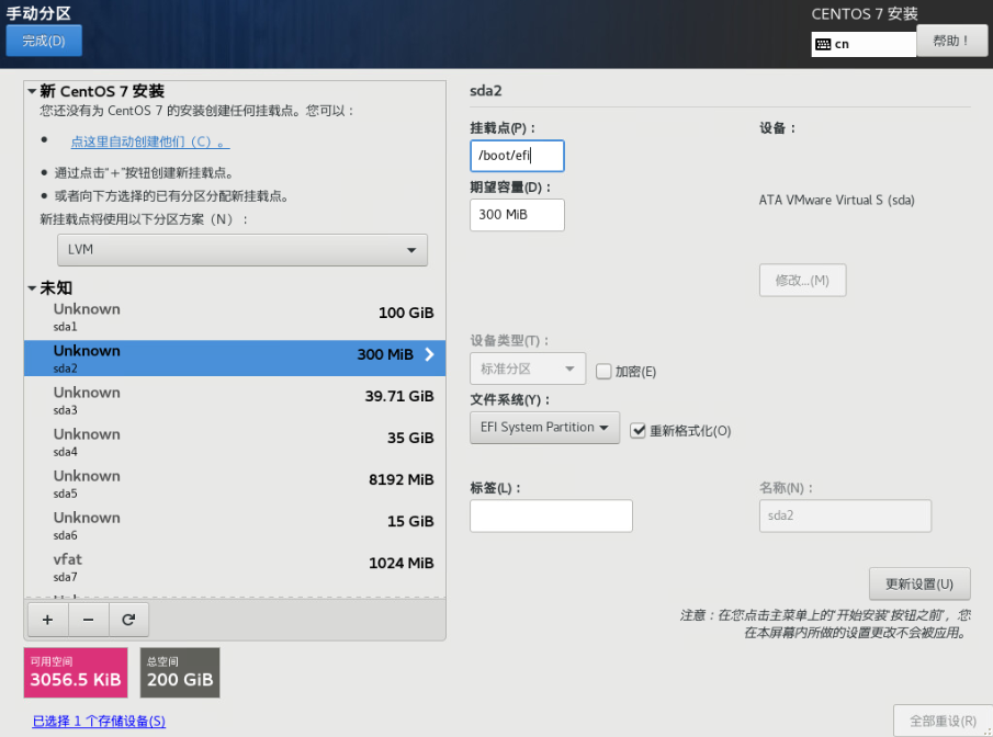 (8)格式化ESP分区,添加挂载点: 选中sda2(300MB),更新设置