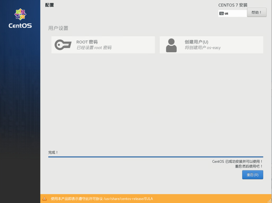 (16)等待centos系统自动安装完成,然后点击重启,重启后拔掉U盘正常进系统.