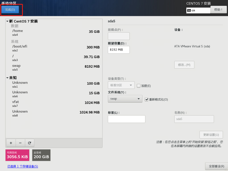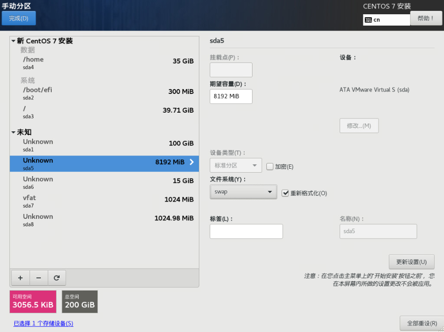 (11)挂载SWAP分区: 选择/dev/sda5,更新设置