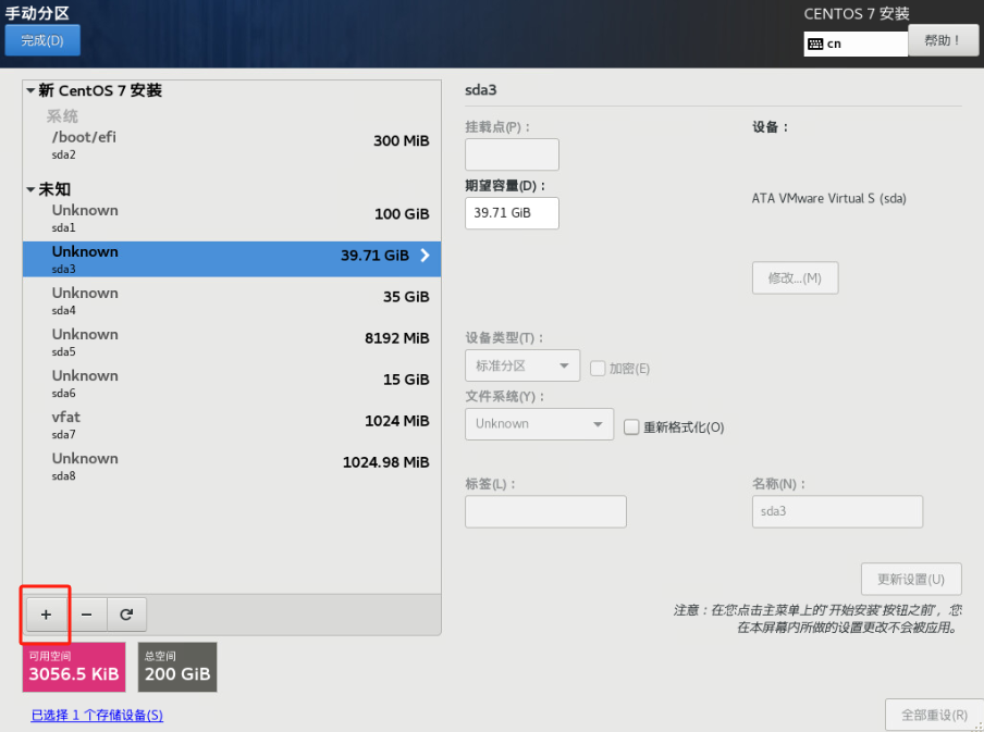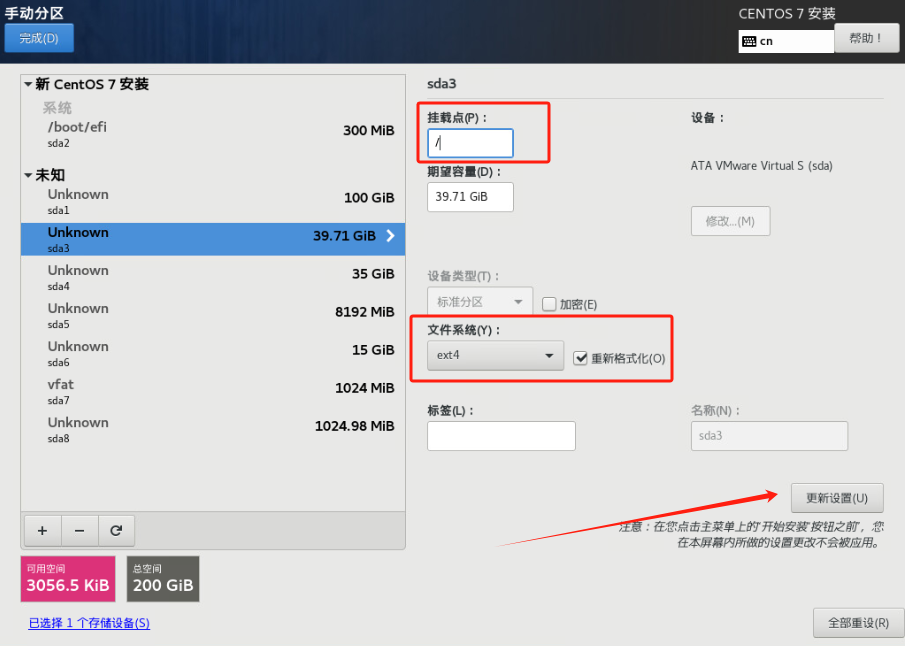(9)挂载根分区: 选择/dev/sda3,选择EXT4格式,更新设置