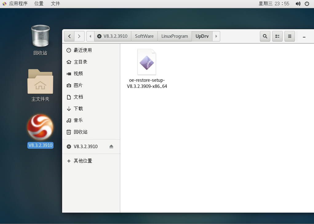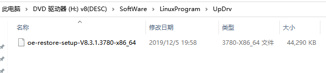 注意:oe-restore-setup-V8.3.2.3909-x86_64为上层驱动文件名,这里只是举例,具体以软件包对应的上层文件名为准.