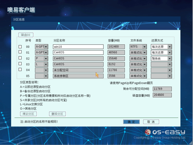 (1)在安装开始前,先进入oss底层选单界面,按“F10”-“分区管理”中新增多个分区给centos使用,划分一个A分区,一个P分区,一个L分区.A分区为centos的/分区,P为home分区,L为swap分区.P和L分区不是强制要求,根据需求创建和分配大小。
