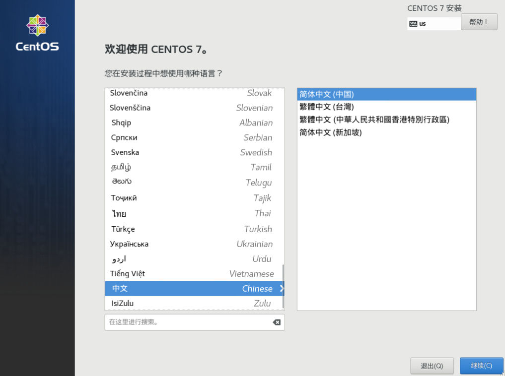 (4)进入centos安装界面,选择install centos选项进入安装模式.选择中文语言.