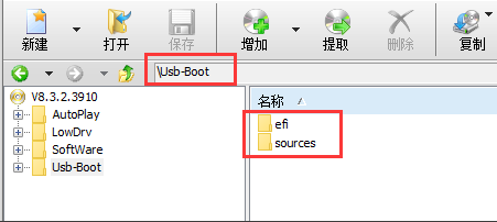 将安装包里的Usb-Boot目录下的efi和sources 这两个文件夹拷贝到fat 32格式的U盘根目录下即可完成V8安装U盘的制作。如下图所示: