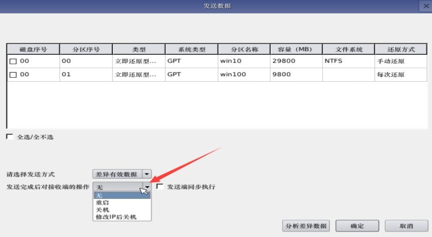 说明:勾选要同传的数据盘,选择差异有效数据(默认差异有效数据,一般就选择默认的即可),对机器的操作建议勾选 “无”,然后点击确定,直至发送端数据发送完成后,执行“远程重启”即可。
