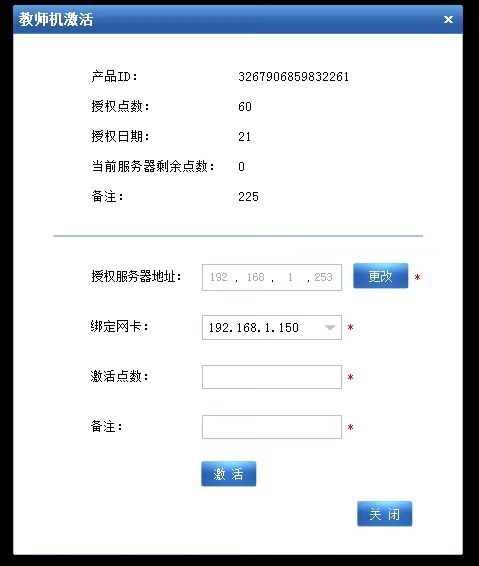 5.然后输入自己想要激活的点数,记得备注中添加教室的信息,以便后续辨认,点击激活关闭即可完成。