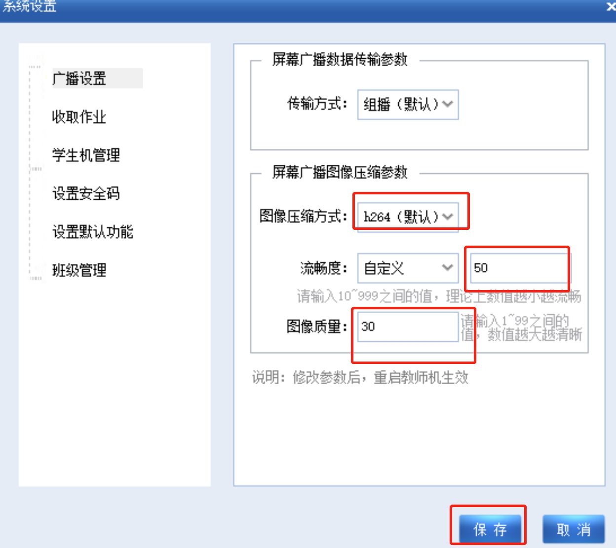 2.将图像压缩方式改成h264,将流畅度、图像质量数值调低(值越小越流畅),修改后点击“保存”即可。