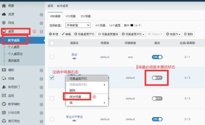 1.首先登录管理平台,【桌面】-----【教学桌面】----选择所要修改的场景,如果是激活状态,先关闭激活,-----选择场景右击------【修改场景】----修改系统盘还原----选择【按周还原】,选择【周一】------【确定】