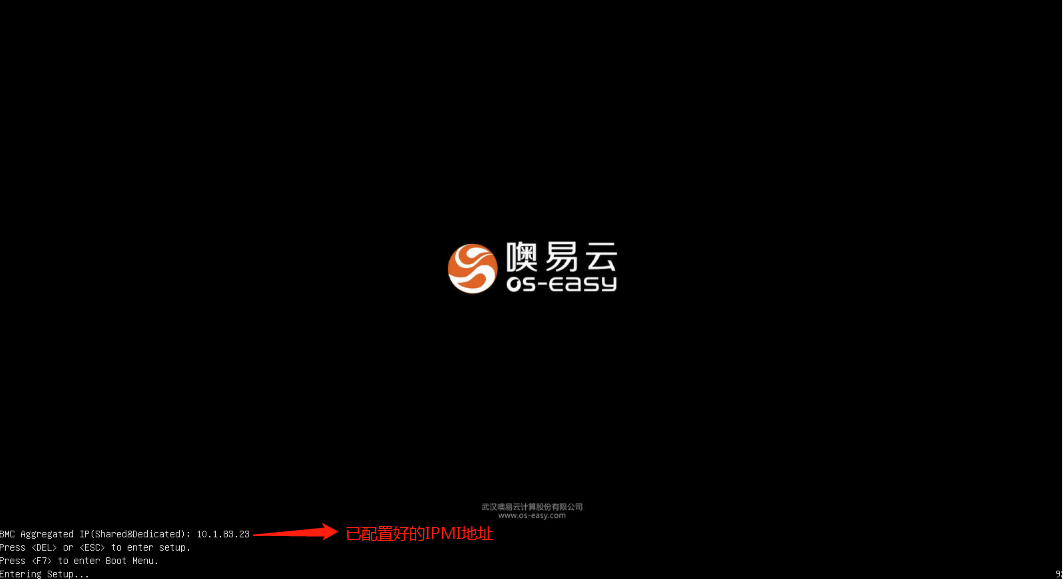 6、填写完毕后按F4保存后,服务器自动重启,生效后开机画面会看到配置的IPMI 地址,如下图所示: