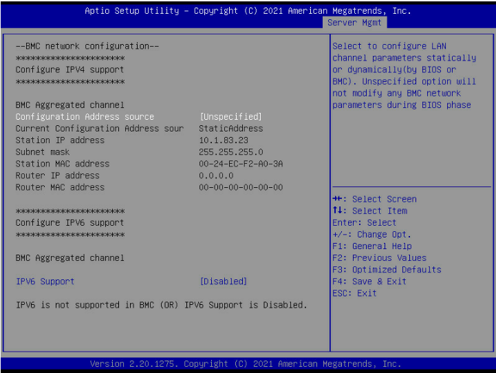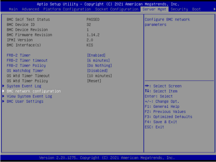 2、选择Server Mgmt目录,找到BMC network configuration选项如下图所示: