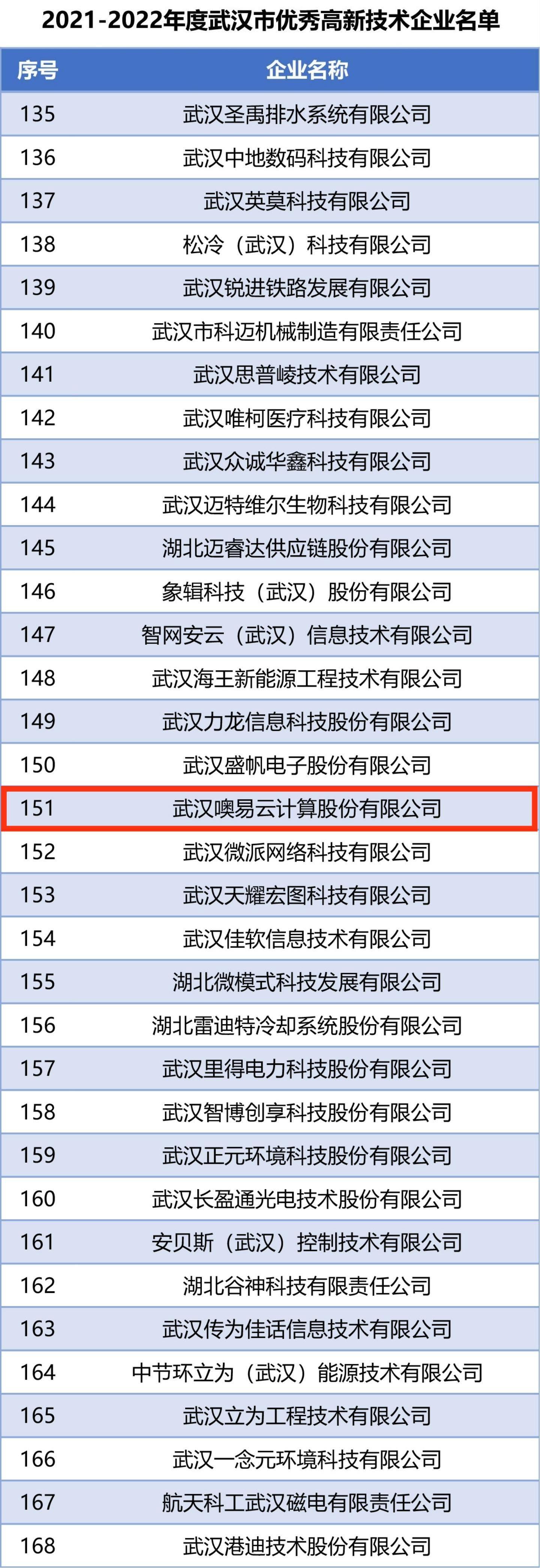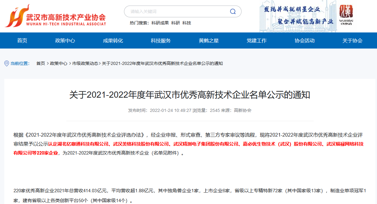2021-2022年度年武汉市优秀高新技术企业公示名单(图)