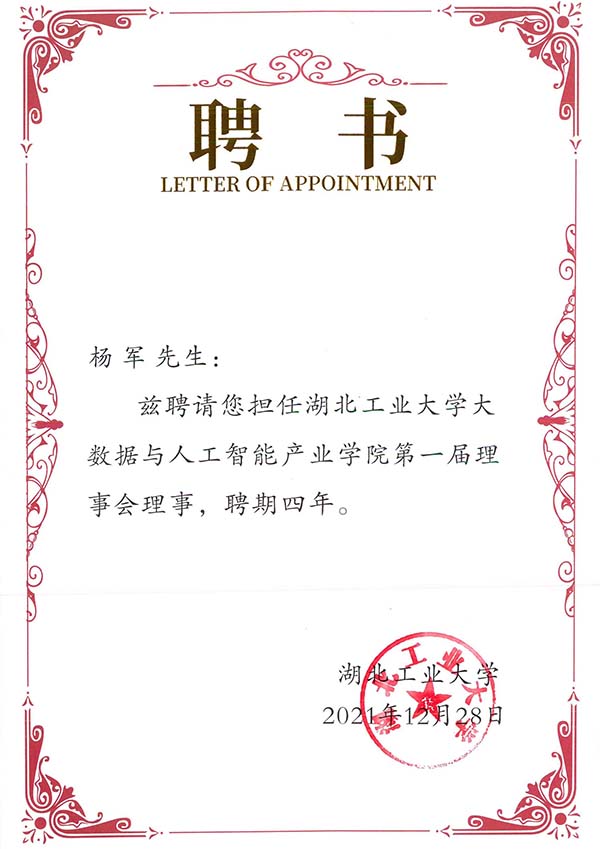 湖北工业大学产业学院理事会聘书(图)