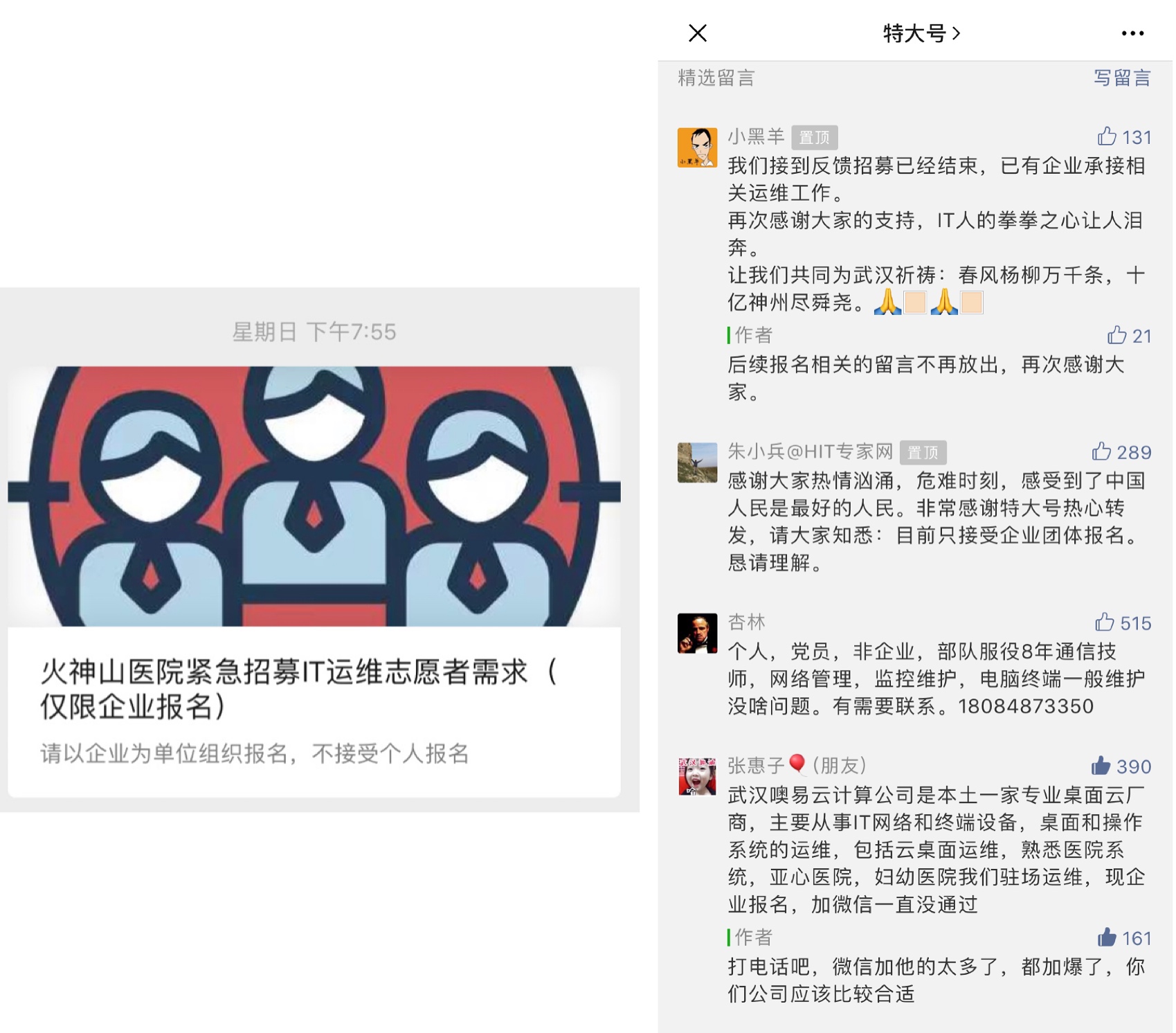 1月26日火神山医院信息筹备组面向全国IT企业公开招募院内IT运维志愿者,噢易云积极响应,火速启动了志愿工程师招募行动。很多噢易云工程师在招募活动发出之前已经积极报名,踊跃请战。