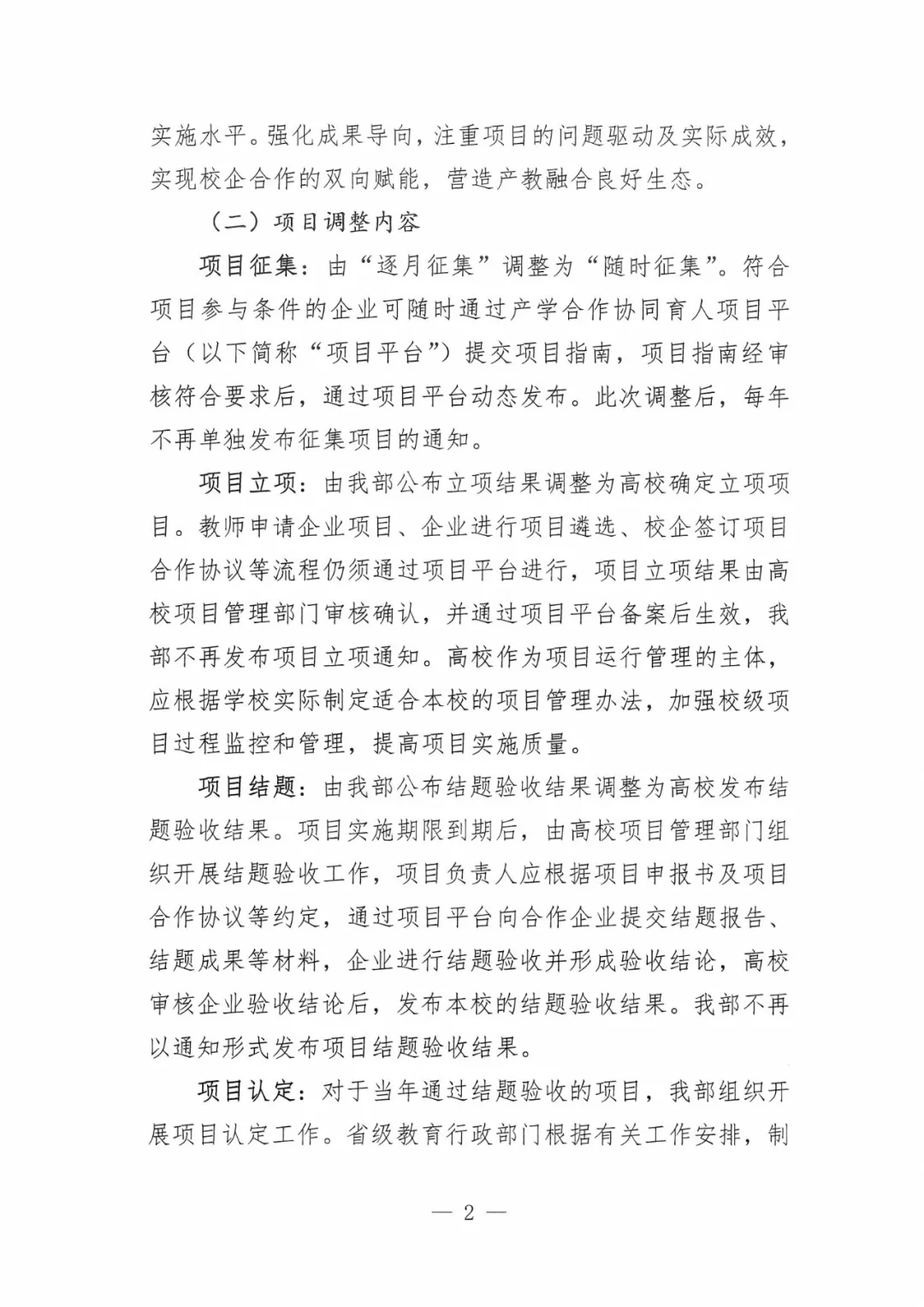 项目结题:由我部公布结题验收结果调整为高校发布结题验收结果。项目实施期限到期后,由高校项目管理部门组织开展结题验收工作,项目负责人应根据项目申报书及项目合作协议等约定,通过项目平台向合作企业提交结题报告、结题成果等材料,企业进行结题验收并形成验收结论,高校审核企业验收结论后,发布本校的结题验收结果。我部不再以通知形式发布项目结题验收结果。