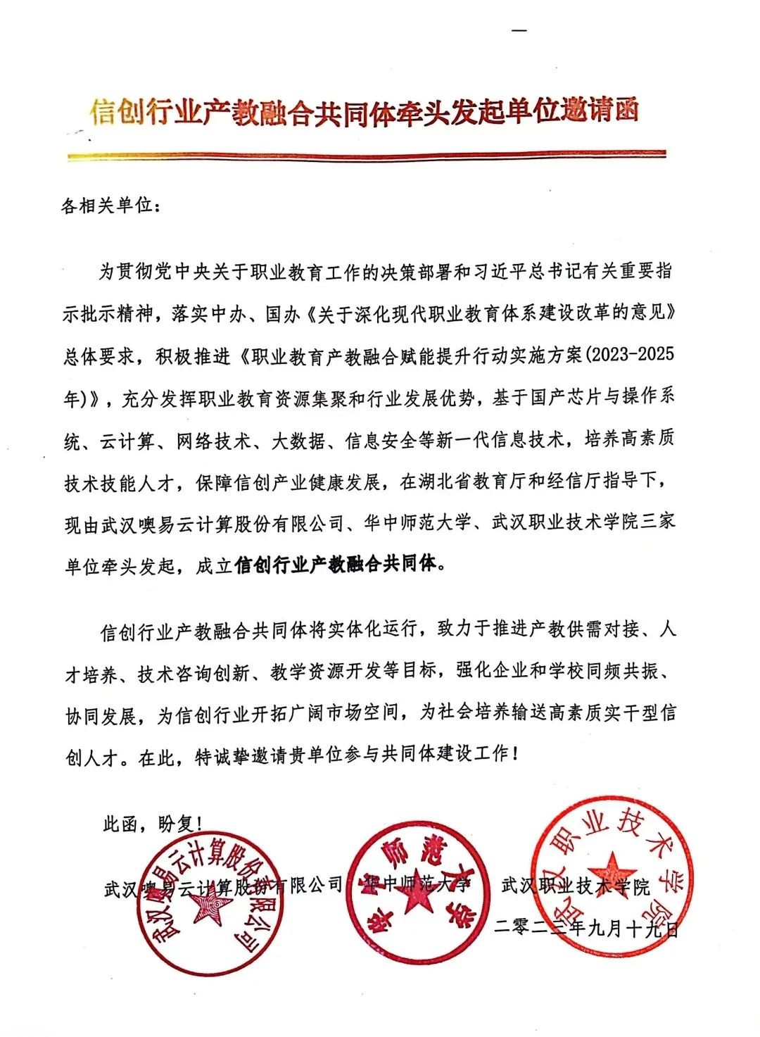 为贯彻党中央关于职业教育工作的决策部署和习近平总书记有关重要指示批示精神,落实中办、国办《关于深化现代职业教育体系建设改革的意见》以及《教育部办公厅关于加快推进现代职业教育体系建设改革重点任务的通知》总体要求,充分发挥职业教育资源集聚和行业发展优势,基于国产芯片与操作系统、云计算、网络技术、大数据、信息安全等新一代信息技术,培养高素质技术技能人才,保障信创产业健康发展,在湖北省教育厅和经信厅指导下,现由武汉噢易云计算股份有限公司、华中师范大学、武汉职业技术学院三家单位牵头发起,成立信创行业产教融合共同体。