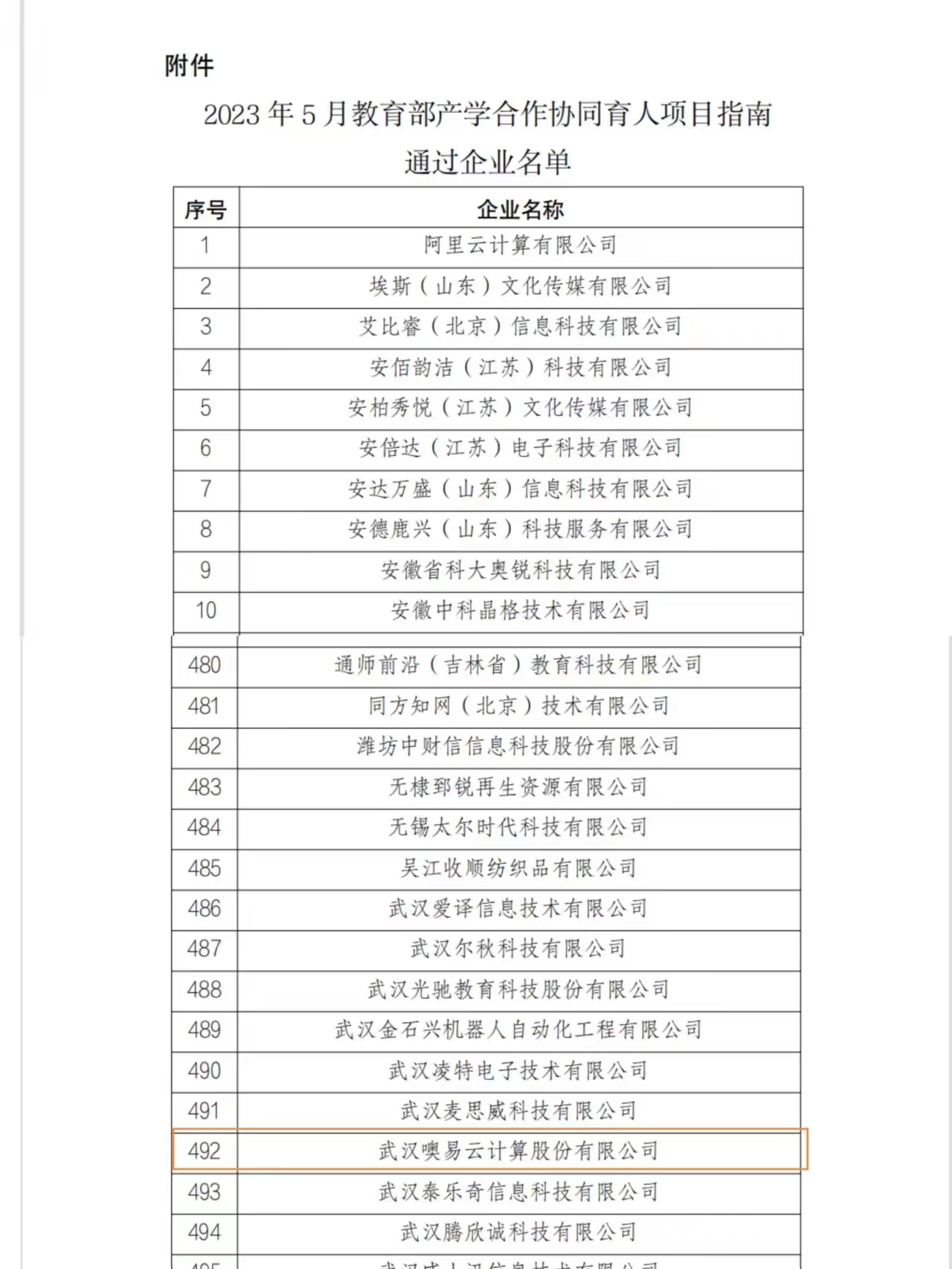 近日,教育部正式发布了《关于公布教育部产学合作 协同育人项目指南通过企业名单(2023年5月)的通知》,武汉 噢易云计算股份有限公司申报的“新工科、新医科、新农科、新文科建设项目”、“教学内容和课程体系改革项目”、“师资培训项目”、“实践条件和实践基地建设项目”四大类别共计19个项目成功入选。