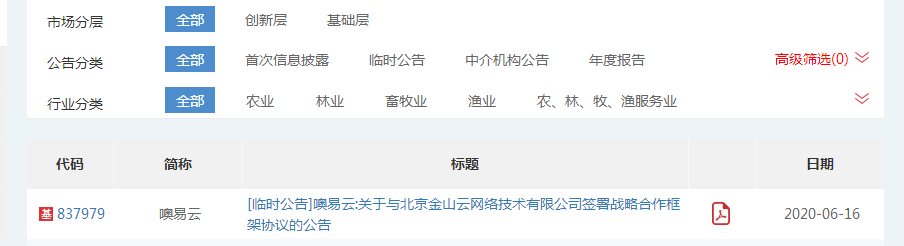 2020年6月16日, 噢易云发布与北京金山云网络技术有限公司签署战略合作框架协议的公告
