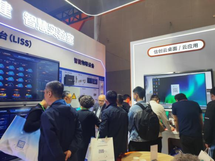 噢易云作为专业的桌面云方案提供商和教育桌面云第一品牌,深耕教育行业十余载,此次展示了孪生教室TSpace、一朵云融合实验室、新基建智慧实验室、计算机实验室智慧服务平台LISS、云终端等互动体验空间,同时设置信创云桌面/云应用展区,全面展示信创云应用、信创融合桌面云、国产云终端等产品,一朵云,覆盖高教全场景桌面应用需求,为到场嘉宾呈现一场精彩纷呈的云上科技盛宴,现场亮点层出不穷,下面一起来看看!