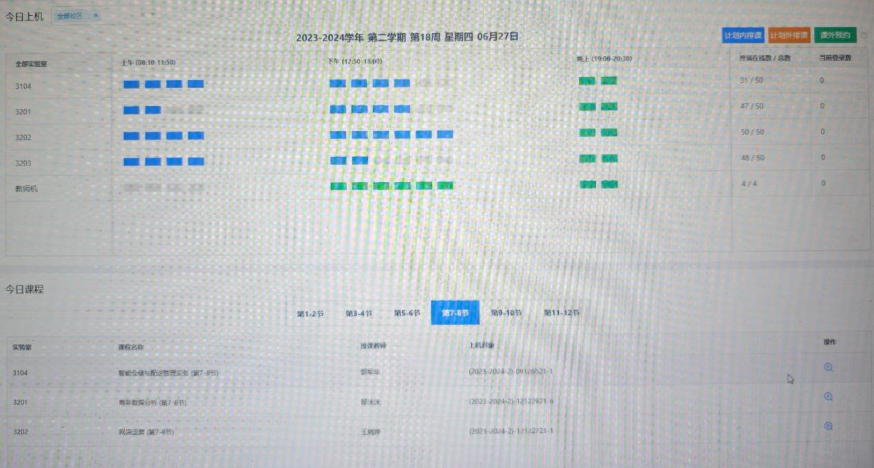 4.数据统计与大屏可视化:自动化采集上机人次、实验室课外利用率等多维度数据,生成统计报表;定制实训大楼 3D 可视化大屏,动态呈现核心指标,直观展示实验室运营成效。
