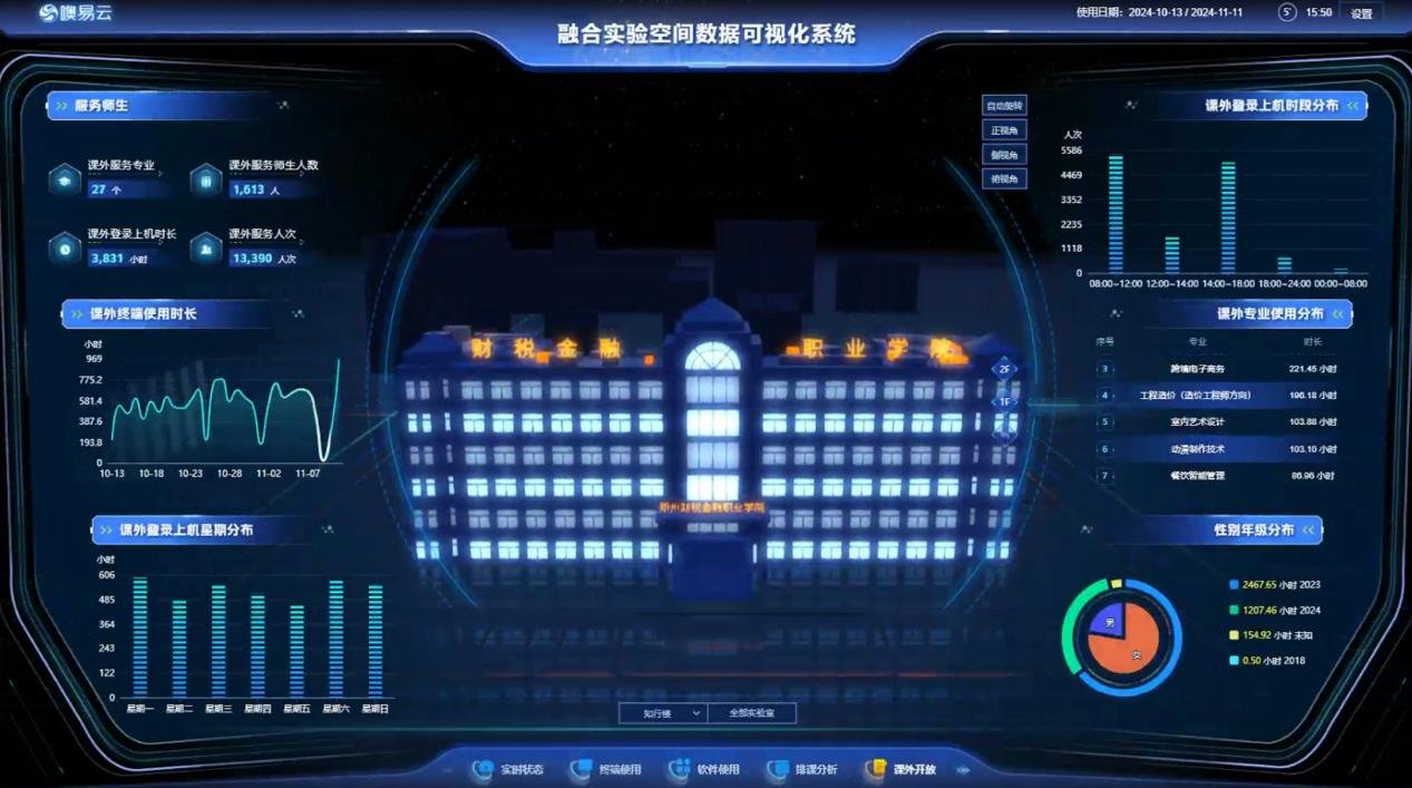 郑州财税金融职业学院依托 204 点 LISS 授权,以“扫码登录留痕 + 课外开放预约”为核心,深度对接账号与课表数据,通过定制化 3D 大屏可视化与智能网络适配,实现实验室高效利用与规范化管理双重目标。