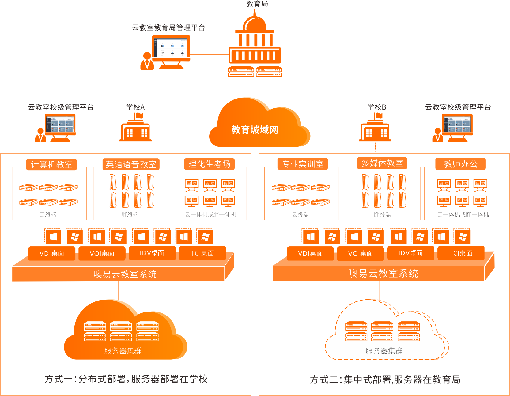 噢易普教云教室是一套融合VDI/VOI/IDV/TCI四种桌面技术架构的桌面云产品,旨在建设符合信息化技术课教学、实训实践课教学、考试的多功能云教室,满足教师教学,学生上课考试,以及设备的云化管理。方案由虚拟化软件和云终端、云服务器组成,包含区教育局+学校两级部署架构。一朵云,满足全场景云桌面应用需求,根据教学场景特点,按需交付不同类型的云桌面,应用于中小学计算机教室/英语语音教室/中学理化生考场、中职专业实训室、多媒体教室、教师办公等场景。