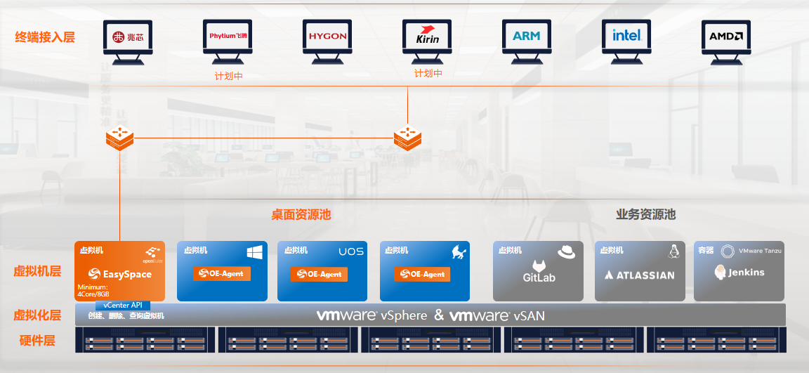 在原有底层虚拟化平台上创建云主机,部署噢易云上产品,实现对已有虚拟化平台接管,可导入原有虚拟桌面或调用底层资源创建新桌面使用,终端用户通过OEIDP协议访问云桌面。