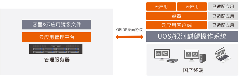 本地云应用是在服务器资源上创建虚拟化环境,将虚拟化环境下发到国产终端操作系统内经容器封装,用户通过云应用客户端直接控制应用运行和交互。