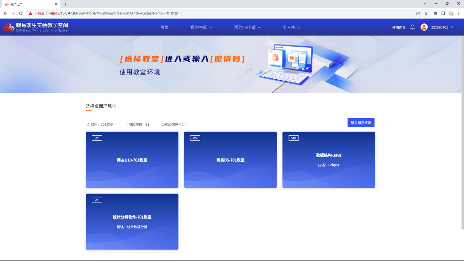 内蒙古财经大学经管实验中心采用TSpace方案构建满足400点并发访问的云端大资源中心,建设4间线上虚拟实验室,承载用友系统、数据结构-Java等专业实践课的教学实践,学生可通过个人电脑和机房终端随时随地自由访问线上教室和实训课桌面。同时在寒暑假期间,为科研、创新实验及竞赛等活动提供高效便捷的环境支持。