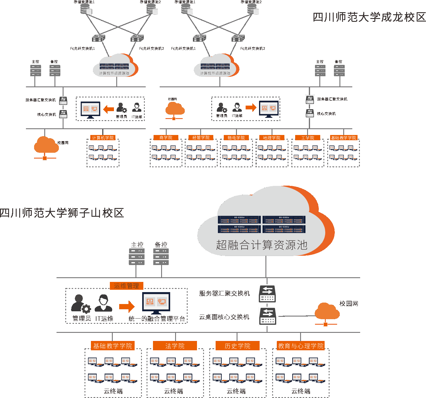 四川师范大学是四川省属重点大学、国家首批“中西部高校基础能力建设工程”实施高校,是四川省举办本科师范教育最早、师范类院校中办学历史最为悠久的大学。在信息化教学和云计算技术越来越普及的趋势下,四川师范大学逐步把计算机科学/基础教学机房、商学院机房、物理电子学院多媒体教室、法学院机房、教育学院机房全部迁移上云。采用噢易融合桌面云解决方案,共部署2200点融合桌面云,2200台云终端,覆盖34间云实验室,服务于狮子山校区和成龙校区的10个学院,累计为10万+师生提供稳定安全高效的教学和办公环境。