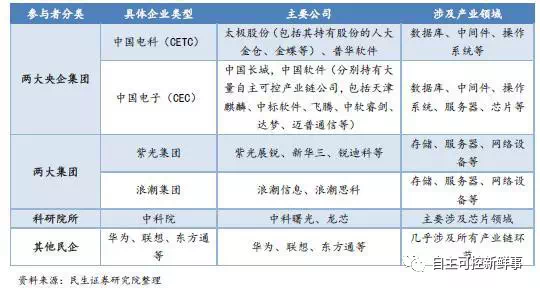 而在自主可控产业链上,主要参与者可以概括为“三大央企 两大集团 知名民企”。“三大央企”包括中国电科(CETC)、中国电子(CEC)与航天科工集团,“两大集团”包括紫光、浪潮集团,科研院所主要是中科院的参与,以及华为、联想、东方通等知名企业。其中操作系统、芯片领域的参与者有中国电科、中国电子、中科院以及知名名企等。