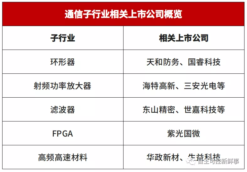 在5G商用化日益临近的背景下,我国在通信行业的众多方向有自主可控的投资机会,比如环形器、射频功率放大器、滤波器、FPGA(现场可编程门阵列)和高频高速材料等。