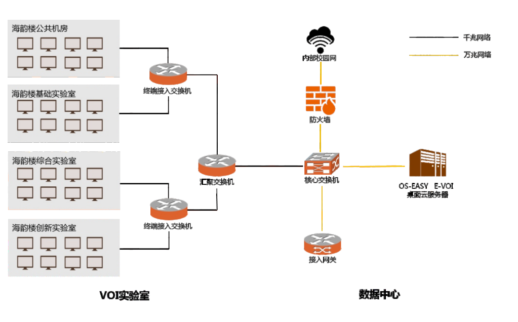 近年来,厦门大学机房的规模逐步扩大,闲置硬件数量众多却无法合理利用,且机房管理模式落后,无法远程集中管理,费时费力。2019年暑假,厦门大学电子科学与技术学院与软件学院合并之际,接触到噢易桌面云技术,在闲置服务器的基础上就老机房进行桌面云改造,利用原有的旧电脑作为终端设备,充分利用之前采购的服务器的计算资源,部署750点的噢易桌面云满足全院师生的计算机基础教学、软件编程实训、自动化实验以及计算机等级考试和部分社会考试项目。