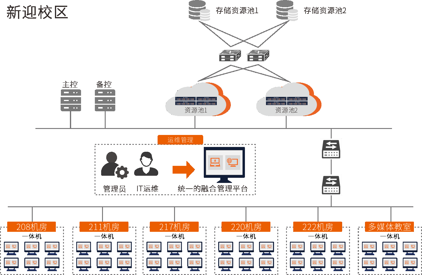 昆明理工大学原有多媒体设备为单机运行模式,无法进行统一的维护更新,急需引进信息化新技术手段,使用云桌面打造区校一体融合管理平台,将新购多媒体终端与原有多媒体设备进行统一管理,以此提升师生服务水平、实现多媒体教室资源互联互通互助、集中统一管控。
